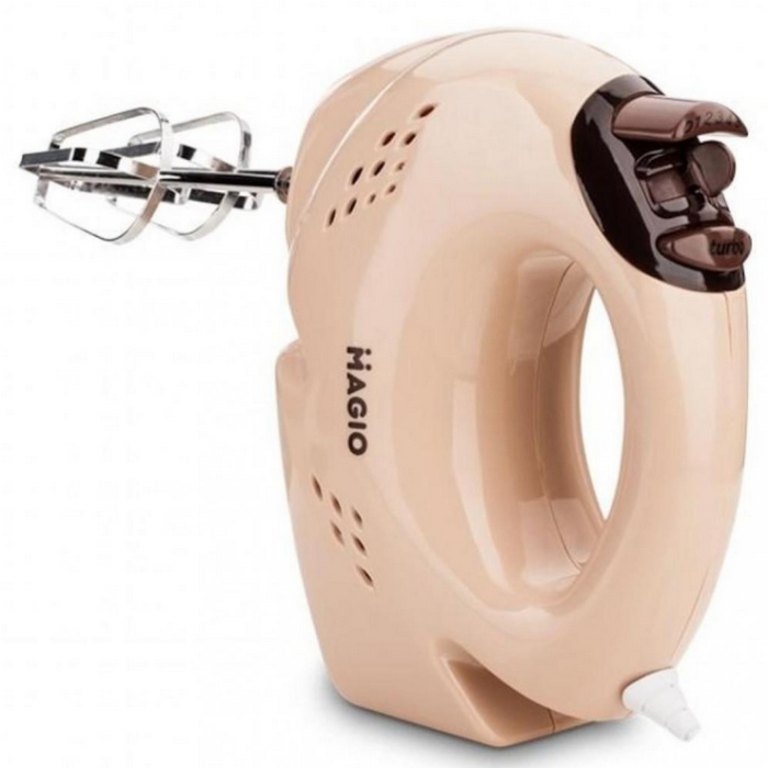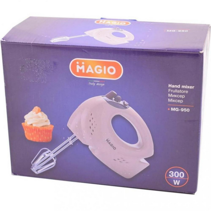 Зручний міксер MG-950 дозволить замішувати різні продукти, використовуючи насадки, що додаються. Від'єднуються насадки швидко за допомогою кнопки. Зручна ручка зробить навіть тривалу роботу з ним легкою та приємною. Потужність складає 300 Вт, що забезпечує швидку та якісну роботу. Міксер має 5 швидкісних режимів для збивання. Функція "Турбо" дозволяє ненадовго значно збільшити швидкість обертання, особливо важлива при швидкому розбиванні грудок у тесті.