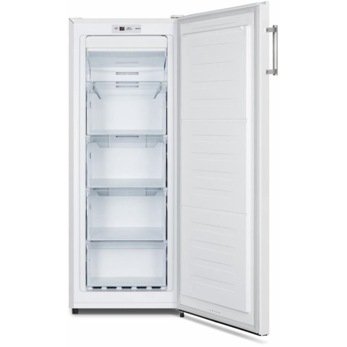 Морозильна шафа Heinner HFF-HS155NFE++ при висоті корпусу 143 см має корисний об'єм 155 літрів. Такої місткості має бути цілком достатньо для сімей із двох або трьох осіб. Морозильна камера передбачає 5 відділень, включаючи великий бокс для чогось габаритного, на зразок цілої індички. Усередині за добу за необхідності можна заморозити до 8 кг продуктів. Окремо варто виділити не саму тиху, але ще й не надто галасливу роботу (до 41 дБ) і енергоспоживання класу E з річним показником витрати в 205 кВт*год.