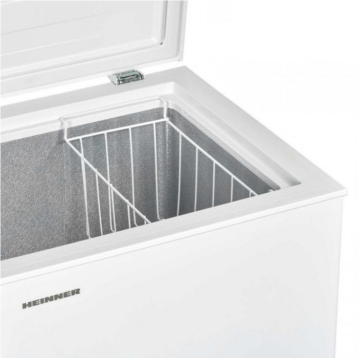 Морозильна камера Heinner має корисну ємність 142 літри. При цьому виглядає техніка досить скромно, не видається громіздкою. Все завдяки тому, що висота 85.4 сантиметра – це стандартна висота меблів. Тому ви можете зручно розмістити морозильник у будь-якому придатному приміщенні. Оскільки модель призначена для великого об'єму продуктів, ви отримуєте зручну ємність для заготовок на зиму, м'яса та риби і навіть для заморожених десертів на літо.