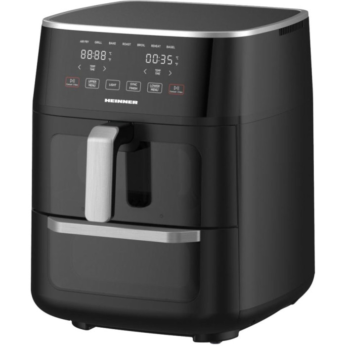 Мультипіч HEINNER HAFO-M11BK1700 – це сучасний кухонний прилад, що поєднує функції аерофрітюрниці та духовки, дозволяючи готувати різноманітні страви з мінімальним використанням або без олії. Загальний об'єм пристрою становить 11 літрів, розподілений між двома камерами: верхньою на 6 літрів та нижньою на 5 літрів.