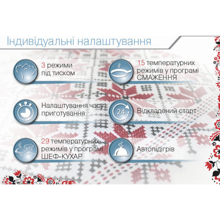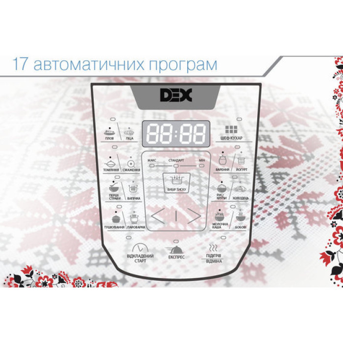 В мультиварке DEX DPC-61 предусмотрено три различных режима работы с давлением, целых 15 режимов при использовании программы "Жарка", а также данная модель оснащена программой "Шеф Повар" с возможностью установить любые настройки по желанию. С помощью этого набора полезных функций у вас будет возможность получить практически все возможные методы приготовления различных ингредиентов начиная от обжаривания, варки или готовки с использованием пара, так и заканчивая получением различных десертов, самых полезных и питательных йогуртов, а также для того, чтоб приготовить варенье. Помимо этого всего мультиварка DEX DPC-61 также будет отличным помощником для диетического или детского питания.