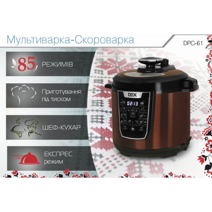 Мультиварка DEX DPC-61 сделает приготовление ваших любимых блюд крайне простым, быстрым и увлекательным. Благодаря наличию целых 85 режимов ваш обычный дневной рацион станет максимально разнообразным и полезным. Причем стоит отметить, что приготовленные в этой мультиварке блюда могут показаться даже вкуснее, чем при традиционной обработке, ведь готовка давлением позволяет максимально сохранить витамины и практически все полезные элементы и свойства всех продуктов.