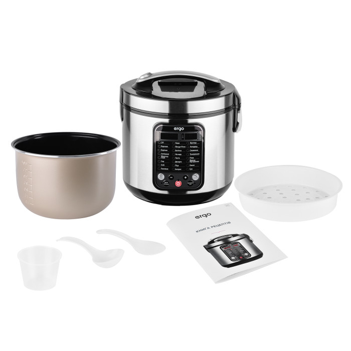 Комплектация мультиварки ERGO EMC 8505 включает в себя контейнер для приготовления на пару, плоскую ложку и черпак, которые не вредят керамическому покрытию, мерный стакан и сборку рецептов великолепных блюд, которые можно приготовить без лишних усилий с помощью данной модели.