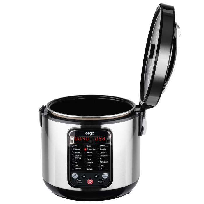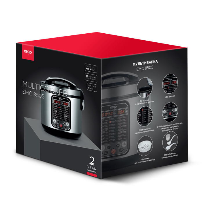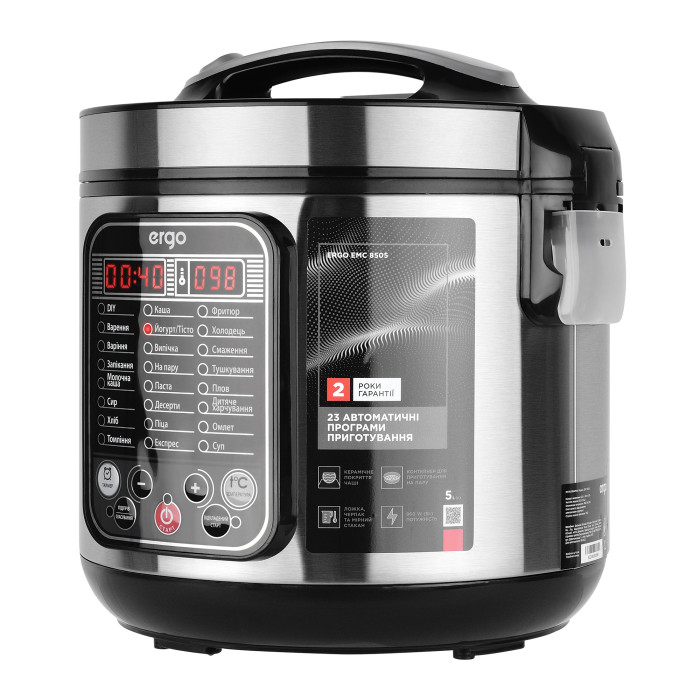 Модель ERGO EMC 8505 создана быть максимально простой и удобной в использовании. Интуитивное управление с помощью LED-дисплея, сенсорных кнопок и понятного меню помогает быстро выбирать нужные приложения и настройки. Надежная конструкция с двойными стенками, паровым клапаном и запиранием крышки при работе защищает кулинара от ожогов и других проблем.