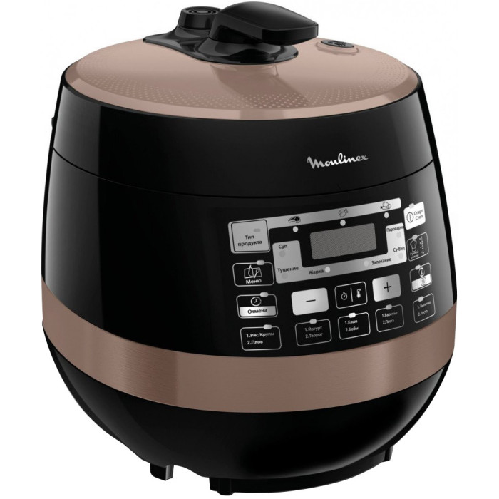 Мультиварка - cкороварка Moulinex CE430A34 випускається в сучасному дизайні в пластиковому корпусі чорного кольору зі світло-коричневою горизонтальною смугою та кришкою. Вона оснащена чашею об'ємом 5 літрів з антипригарним покриттям та внутрішньою опуклою шкалою. Модель потужністю 1000 Вт управляється електронними кнопками, якими вибираються 33 вбудовані програми. Серед них є функція «Свій рецепт», коли всі налаштування задаються користувачем, щоб приготувати щось особливе для сім'ї, друзів чи себе. Автоматичні програми готують різні страви, в тому числі дієтичні на пару, йогурт і продукти у вакуумі Sous-Vide. Особливістю приладу є можливість приготування під тиском. У цьому випадку продукти зберігають максимальну кількість корисних речовин та готуються набагато швидше. Мультиварка - cкороварка Moulinex CE430A34 забезпечена таймером відстрочення, а також здатна підтримувати температуру приготовленої їжі або просто розігрівати їжу.