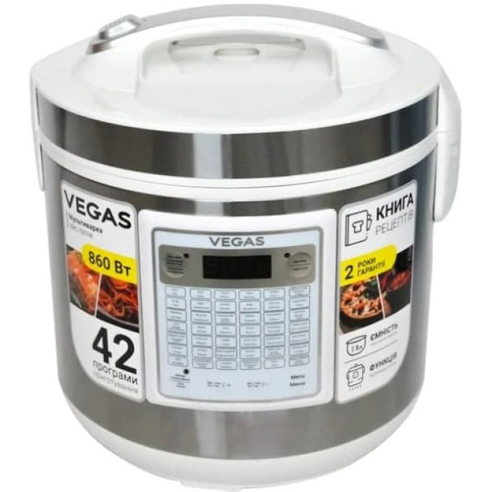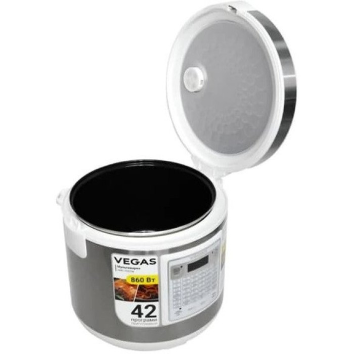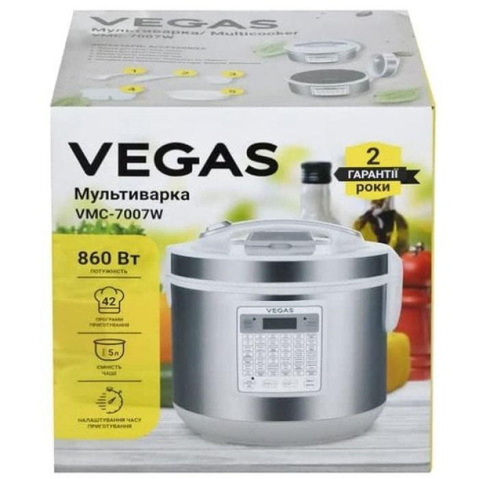 Мультиварка Vegas VMC-7007W на 42 програми приготування, включаючи програми для фритюру, колодця, фондю, смаження, випічки та приготування йогуртів. Крім того, включає можливості приготування супів, каш, а також таких продуктів як голубці або піца. Крім того, є функція приготування на пару. З антипригарною чашею на 5 л. Потужність: 860 Вт. Доповнена функцією підтримки тепла, таймером та можливістю задати час вручну. З невеликим пластиковим відсіком для збирання рідини. У комплект мультиварки входить книга рецептів.