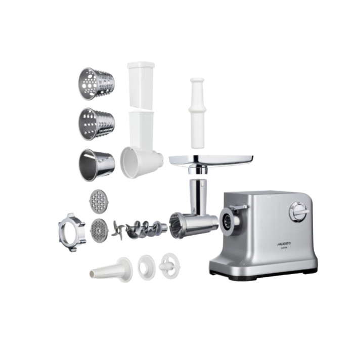Премиальная мясорубка в металлическом корпусе с мощностью 2200 Вт, двумя скоростями работы и сменными насадками для приготовления фарша, домашних колбасок и кеббе, а также насадкой для терки и шинковки.