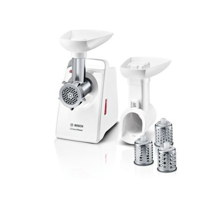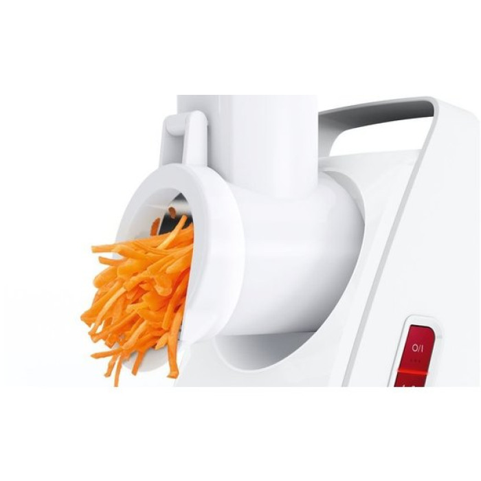 Функционал мясорубки Bosch MMWPL3003 дополнен 3 насадками-терками и приставкой-овощерезкой. Это указывает на многофункциональность устройства: с его использованием можно измельчать овощи для заготовок и др. Для хранения насадок и шнура в корпусе предусмотрены специальные отсеки. Ручка для переноски и прорезиненные ножки способствуют удобству использования, хранения и транспортировки.