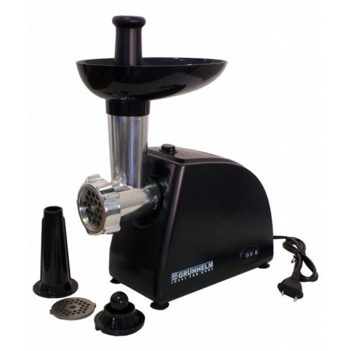 Электромясорубка Grunhelm AMG140B выполнена в стильном чёрном цвете и элегантном современном дизайне. Она будет гармонично смотреться на любой кухне. Модель оборудована двигателем максимальной мощностью 1400 Вт и способна измельчить 1,7 кг продуктов за минуту. Используя металлические решётки с диаметрами отверстий 5 и 7 мм, можно готовить фарш из мяса двух видов консистенции. Для быстрого и лёгкого приготовления домашних колбасок и кеббе имеются специальные насадки. Функция реверс предназначена для обратного выталкивания непереработанных кусков продуктов в рабочей камере, чтобы их удалить или вторично переработать. С помощью пластикового лотка и толкателя удобно и безопасно подавать подготовленные ингредиенты на измельчение. Электромясорубка Grunhelm AMG140B оснащена терморегулятором, защищающим её двигатель от перегрева.