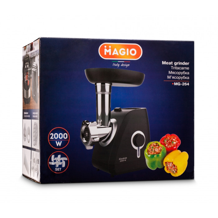 Мощная мясорубка MG-264 в 2000 Вт поможет Вам быстро и с легкостью измельчит мясо, рыбу и овощи. Два режима работы помогут справиться даже с жёстким мясом и жилками. Также в комплекте с мясорубкой идет два ножа из нержавеющей стали, которые прослужат Вам долго. Загрузочная платформа позволит с большим удобством обеспечить подачу исходного продукта. При этом маленькие кусочки не будут падать мимо. С помощью насадки для колбасок Вы сможете легко приготовить домашние колбаски, сосиски или сардельки: натуральная оболочка крепится на эту насадку, насадка – на шнек, и Вам остается только контролировать процесс наполнения будущей колбаски фаршем. А насадка «кеббе» поможет Вам получить полые трубочки, для последующего наполнения их фаршем и обжаривания. Функция «Реверс» поможет справиться с застрявшей едой и Вам не придётся разбирать прибор и извлекать то, что мешает его работе, вручную.