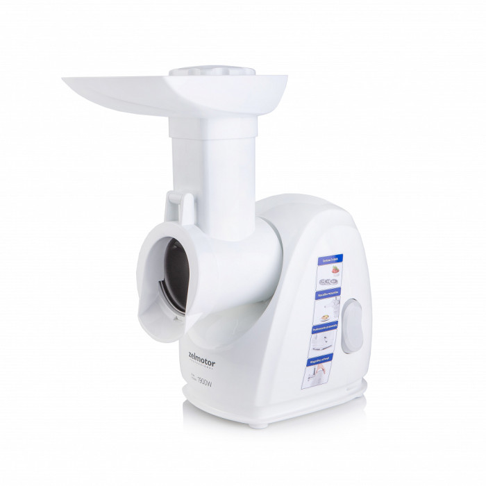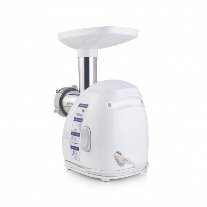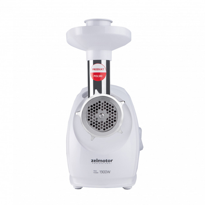 Дуже ефективна м'ясорубка ZELMOTOR 489.81 характеризується високою робочою потужністю - пікова потужність - 1900 Вт, завдяки якій вона здатна переробляти до 2,5 кг м'яса в хвилину. Стійкість пристрою під час роботи забезпечується прогумованими не ковзаючіми ніжками. М'ясорубка має запобіжну муфту для захисту двигуна від пошкоджень в разі блокування. ZELMOTOR 489.81 оснащений насадкою овочерізки, яка буде корисна для швидкого приготування овочевих салатів. У набір також входять три вида решіток з нержавіючої сталі з діаметром отворів 2,7 мм, 4 мм і 8 мм відповідно, а також чотири типи барабанчика терок: для великої шинкування, для дрібної шинкування, для нарізки скибочками і для приготування дерунів.