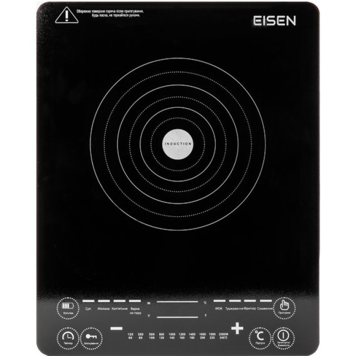 Модель EISEN EIP-237S Slim оснащена режимом автоматичного виявлення посуду та таймером до 240 хвилин. Також є функція "Блокування від дітей". Варильна поверхня легко блокується натисканням символу замочка