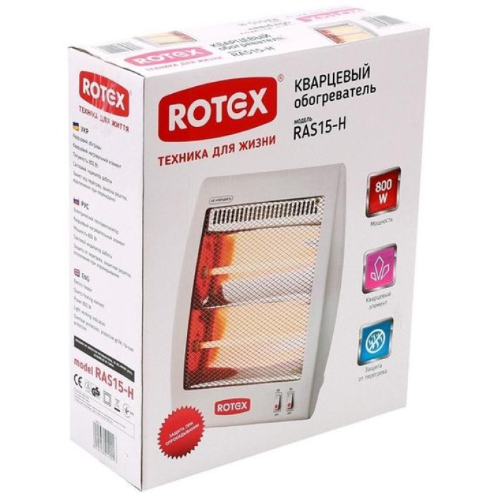 Инфракрасный обогреватель Rotex RAS15-H оснащен кварцевым нагревательным элементом и представляет собой безопасный и простой в эксплуатации бытовой прибор, который поможет создать комфортную температуру в небольших помещениях в холодное время года. Конструкция обогревателя имеет привлекательный внешний вид и высокую степень безопасности. Это компактная переносная модель, с размерами корпуса 290x130x240 мм и весом всего 1,48 кг. Качественное исполнение и использование надежных материалов позволяют рассчитывать на продолжительный срок службы, а управление прибором осуществляется с помощью двух, вынесенных на переднюю панель корпуса, переключателей. Имеется возможность выбора одного из двух рабочих режимов - 0,4 и 0,8 кВт, а за безопасность работы прибора отвечают эффективная защита от перегрева и случайного опрокидывания.