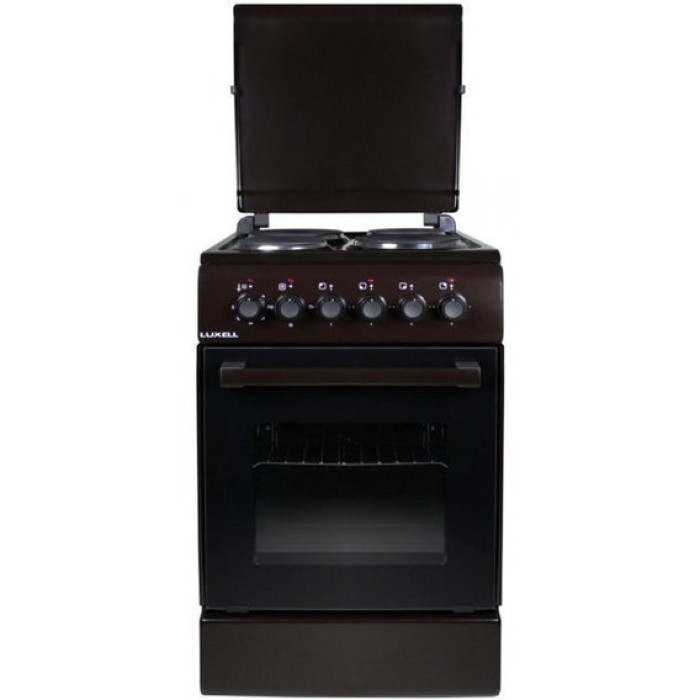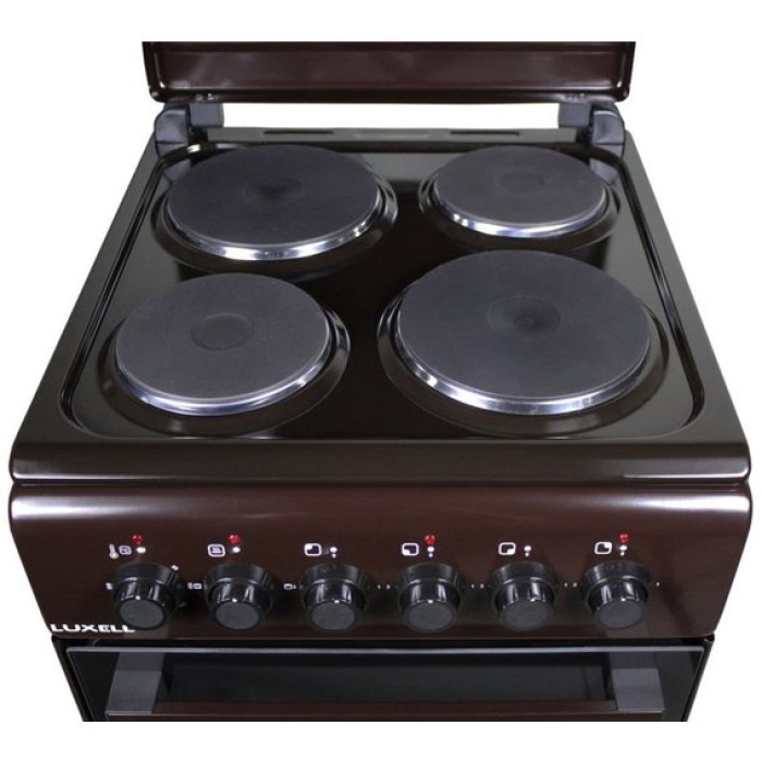 Электроплита LUXELL LF55S-04 имеет четыре электрические зоны нагрева на рабочем столе. Управляются конфорки поворотными рукоятками на фронтальной панели. Там же расположены индикаторы работы духовки и конфорок рабочего стола.