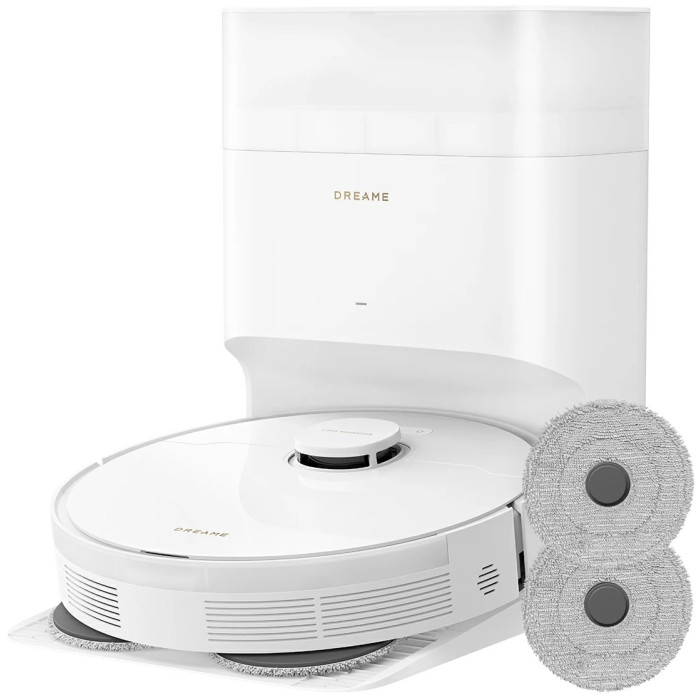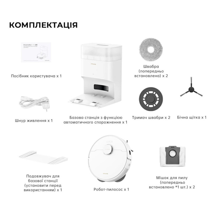 Робот, базова станція, дві дискові серветки, два тримачі серветок, бічна щітка, прогумована V-подібна щітка, запасний мішок для сміття, кабель мережевого живлення, подовжувальна пластина для базової станції, інструмент для чищення пристрою, інструкція користувача