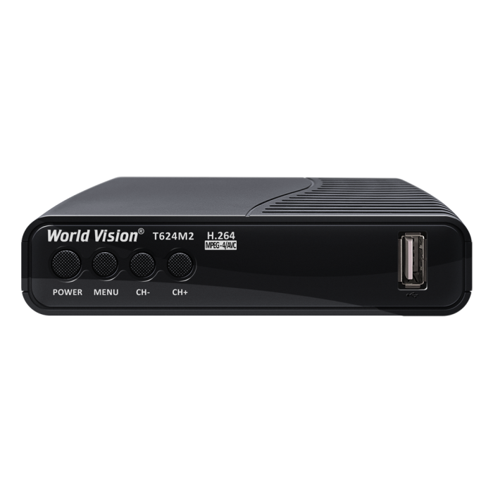 Новая комбинированная модель World Vision T624M2 базируется на высокопроизводительном процессоре GUOXIN GX6701, поддерживает прием цифрового ТВ в стандартах эфирного DVB-T/T2 и кабельного DVB-C телевидения. Данная модель представляет собой обновлённую модификацию телеприставки T62M2, но уже с новым аппаратным обеспечением, а также графической оболочкой которая по удобству управления не уступает предыдущей, все программные изменения тщательно проработаны и изменены только на повышение стабильности работы нового программного обеспечения. В телеприставке World Vision T624M2 установлен хорошо зарекомендовавший себя тюнер MaxLinear MXL608, обладает хорошей чувствительностью приёма DVB-T/T2 и DVB-C сигнала, в результате пользователь получает стабильность трансляции и качественное цифровое изображение на экран своего телевизора. Как и во всех новых моделях цифровых телеприставок World Vision, присутствует возможность подключения устройства к беспроводной сети через внешний USB Wi-Fi адаптер, поскольку не все модели адаптеров подходят для реализации такого вида соединения, то подробная информация указана в характеристиках на устройство. При подключении к сети интернет пользователь получит дополнительный программный функционал, это обновление программного обеспечения по сети интернет, информация о прогнозе погоды на неделю в приложении "Погода", плеер IPTV для просмотра интернет трансляций ТВ каналов, онлайн-кинозал Мегого с огромной медиатекой фильмов, сериалов и мультфильмов, RSS новости. Модель World Vision T624M2 после подключения в USB разъём накопителя памяти, поддерживает всевозможные PVR функции, стандартная немедленная запись телепрограммы, запись по таймеру установленному в ручном режиме или через телегид расписания по программам, отложенный просмотр таймшифт. В программном обеспечении удалось реализовать все функции предыдущего популярного у пользователей модельного ряда Т62, а также модифицировать их, такие, как: синхронизация времени по сети интернет, загрузка в режим ожидания при аварийном отключение электричества, стартовая загрузка телеприставки в режим IPTV плеера, регулировка яркости LED дисплея как в рабочем режиме, так и режиме ожидания. Отличие World Vision T624M2 перед другими ТВ приставками нового модельного ряда построенного на процессоре GUOXIN GX6701, это отсутствие светодиодного LED дисплея и наличие кнопок управления на лицевой панели корпуса, данная модель занимает бюджетный ценовой сегмент устройств. Программное обеспечение адаптировано таким образом, что подходит на все телеприставки World Vision построенные на платформе GX6701.