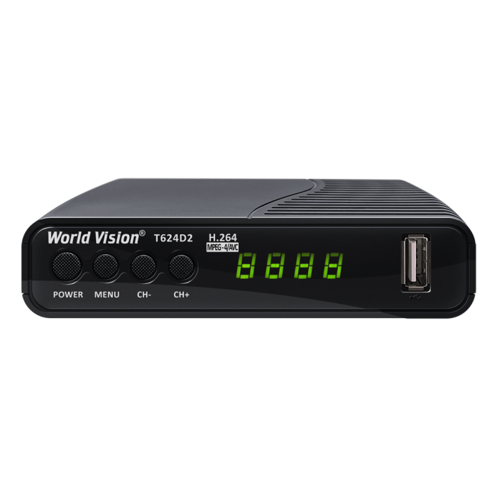 Новая комбинированная модель World Vision T624D2 базируется на высокопроизводительном процессоре GUOXIN GX6701, поддерживает прием цифрового ТВ в стандартах эфирного DVB-T/T2 и кабельного DVB-C телевидения. Данная модель представляет собой обновлённую модификацию телеприставки T62D2, но уже с новым аппаратным обеспечением, а также графической оболочкой которая по удобству управления не уступает предыдущей, все программные изменения тщательно проработаны и изменены только на повышение стабильности работы нового программного обеспечения. В телеприставке World Vision T624D2 установлен хорошо зарекомендовавший себя тюнер MaxLinear MXL608, обладает хорошей чувствительностью приёма DVB-T/T2 и DVB-C сигнала, в результате пользователь получает стабильность трансляции и качественное цифровое изображение на экран своего телевизора. Как и во всех новых моделях цифровых телеприставок World Vision, присутствует возможность подключения устройства к беспроводной сети через внешний USB Wi-Fi адаптер, поскольку не все модели адаптеров подходят для реализации такого вида соединения, то подробная информация указана в характеристиках на устройство. При подключении к сети интернет пользователь получит дополнительный программный функционал, это обновление программного обеспечения по сети интернет, информация о прогнозе погоды на неделю в приложении "Погода", плеер IPTV для просмотра интернет трансляций ТВ каналов, онлайн-кинозал Мегого с огромной медиатекой фильмов, сериалов и мультфильмов, RSS новости. Модель World Vision T624D2 после подключения в USB разъём накопителя памяти, поддерживает всевозможные PVR функции, стандартная немедленная запись телепрограммы, запись по таймеру установленному в ручном режиме или через телегид расписания по программам, отложенный просмотр таймшифт. В программном обеспечении удалось реализовать все функции предыдущего популярного у пользователей модельного ряда Т62, а также модифицировать их, такие, как: синхронизация времени по сети интернет, загрузка в режим ожидания при аварийном отключение электричества, стартовая загрузка телеприставки в режим IPTV плеера, регулировка яркости LED дисплея как в рабочем режиме, так и режиме ожидания. Отличие World Vision T624D2 перед другими ТВ приставками нового модельного ряда построенного на процессоре GUOXIN GX6701, это наличие светодиодного LED дисплея, наличие кнопок управления на лицевой панели корпуса, встроенный блок питания, данная модель занимает средний ценовой сегмент устройств. Программное обеспечение адаптировано таким образом, что подходит на все телеприставки World Vision построенные на платформе GX6701.