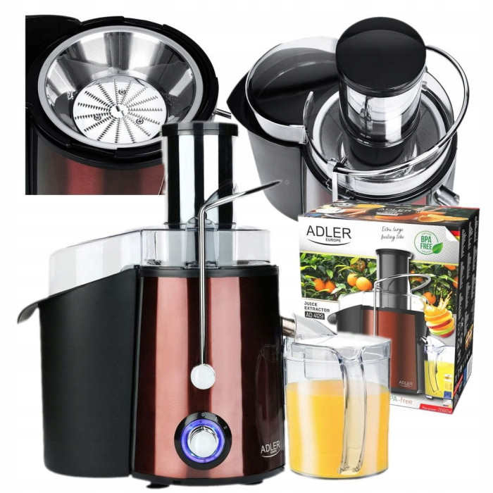 Функціональний соковитискач потужністю 1000 Вт із сучасної серії з унікальним дизайном. Дозволяє готувати фруктові та овочеві соки, завдяки чому допомагає дбати про здоров'я користувачів. Фільтрація відбувається через дрібне сито із нержавіючої сталі, яке затримує тверді частинки. Таким чином, у глечик потрапляє тільки сік, що містить найбільше вітамінів. Залишки пульпи та кісточок відокремлюють у другий контейнер. Завдяки запобіжнику неможливо увімкнути неправильно зібраний прилад. Соковитискач AD 4129 дозволяє дуже швидко приготувати велику кількість соку, що гарантується великою потужністю двигуна і глечиком для соку об'ємом 1 л. Для більшої зручності пластикові частини соковижималки можна мити в посудомийній машині.