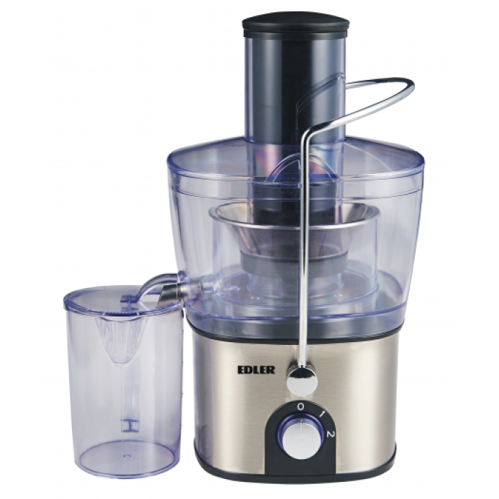 Соковитискач, потужність 1000 Вт, 2 швидкості, об'єм резервуара для соку - 1 л, об'єм резервуара для м'якоті - 1.7 л, фільтр, леза з нерж. сталі, діаметр горловини 75 мм, корпус із нерж. сталі.