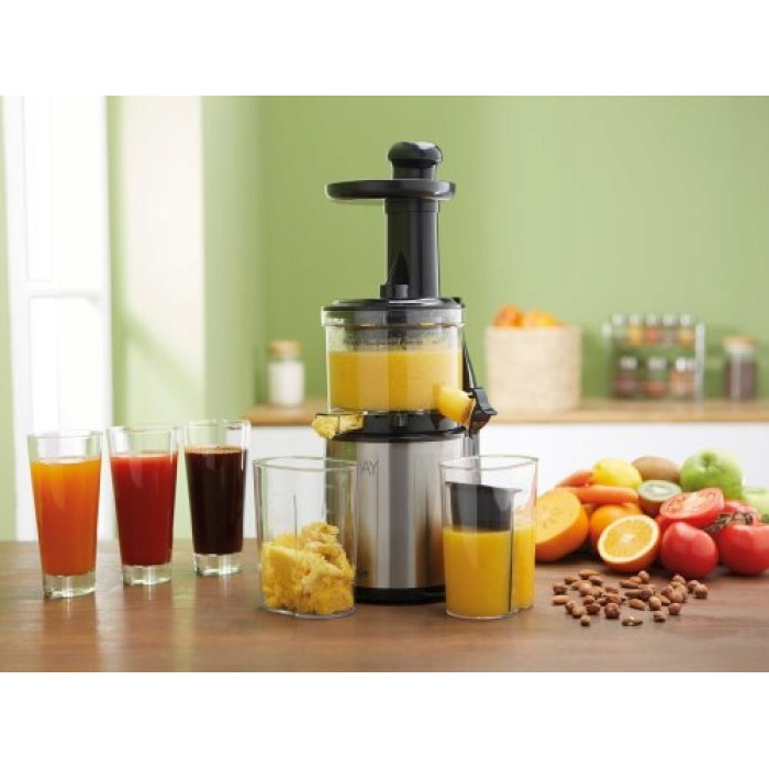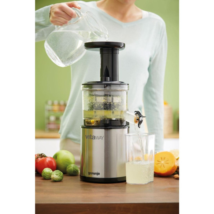 Удобная и практичная соковыжималка шнекового типа Gorenje JC4800VWY станет хорошим помощником в любом доме, ведь с его помощью можно быстро и легко выжать сок практически из любых продуктов. Мощность двигателя Gorenje JC4800VWY составляет 200 Вт, при этом достигается количество оборотов в 80 об/мин. В данной модели присутствует система автоматической настройки скорости вращения в зависимости от вида продуктов, которую удачно дополняет реверсивное вращение, что позволяет добиться максимальной эффективности при выдавливании сока. Из характеристик соковыжималки следует отметить объем контейнера для сока и контейнера для мякоти по 0,9 л каждая