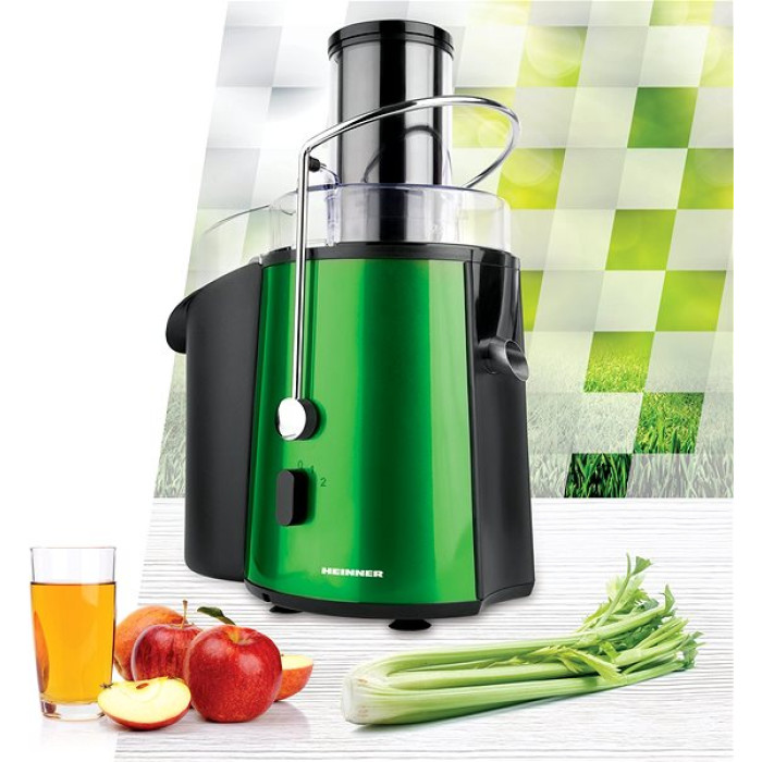 1000Вт, 2 швидкості, завантаження "цілком" шириною 75мм, обсяг резервуара для м'якоті: 2л, обсяг резервуара для соку: 1л, зелений