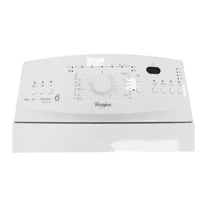 Окрема пральна машина з вертикальним завантаженням Whirlpool AWE 66710 має корпус білого кольору зі сталі. Зверху встановлені горизонтальні дверцята, які піднімаються вгору. За нею встановлена панель управління з кнопками, що мають підсвічування, LED-дисплеєм та перемикачем дисків. Лоток для прального порошку розміщено під верхньою декоративною кришкою.