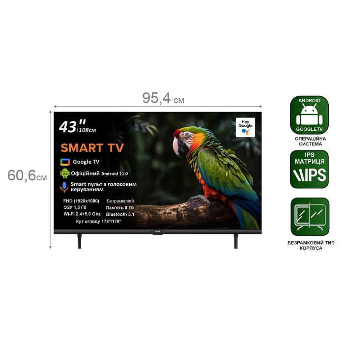 Диагональ::43", Мощность звука::20 Вт (2x10 Вт), Размеры без подставки (ШxВxГ)::954.5х88.2х558.3 мм, Цвет::Черный, Разрешение::1920x1080, Тип::LED, Вес::8 кг, Телетекст::Есть, Формат экрана::16:9, Светодиодная (LED) подсветка::, Таймер::Есть, Разъемы::2 x USB, 2 x HDMI, LAN (Ethernet), USB::Есть, Гарантия::, Размеры с подставкой (ШxВxГ)::954.5х199.2х606 мм, Дополнительно: :, Цифровой тюнер::DVB-T2, DVB-S2, DVB-C, Операционная система::Google TVОфициальный Android 11.0, Стандарт VESA::200x200