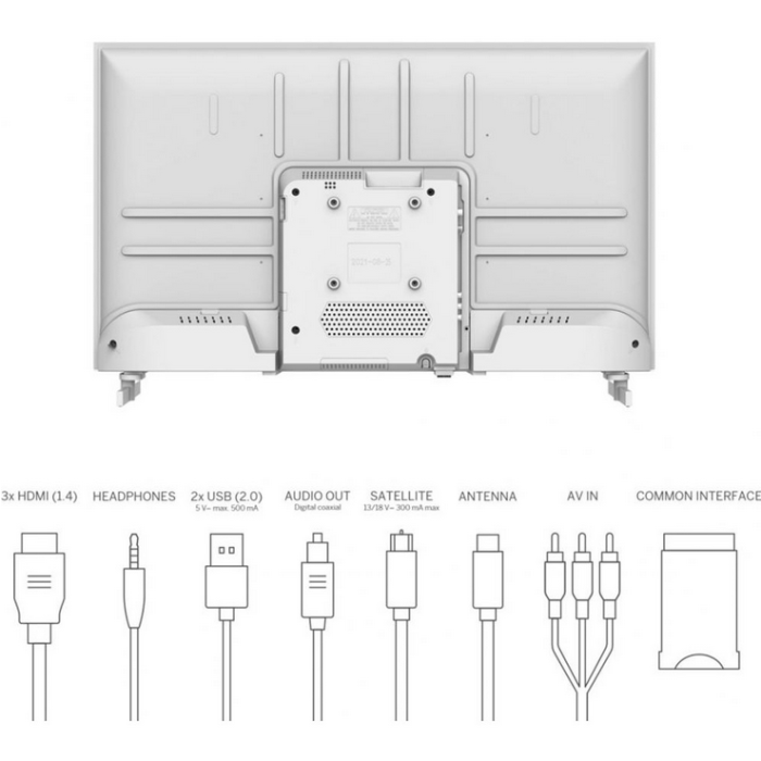 Диагональ::32", Мощность звука::16 Вт, Размеры без подставки (ШxВxГ)::955x589x83 мм, Цвет::Белый, Разрешение::1366x768, Тип::LED, Вес::, Телетекст::, Формат экрана::, Светодиодная (LED) подсветка::Нет, Таймер::Есть, Разъемы::3 HDMI / 2 USB / LAN / композитный, USB::Есть, Гарантия::, Размеры с подставкой (ШxВxГ)::719x456x151 мм, Дополнительно: :, Цифровой тюнер::DVB-S2, DVB-C, DVB-T2 + аналоговый, Частота развёртки экрана::, Операционная система::Без ОС, Стандарт VESA::100x100