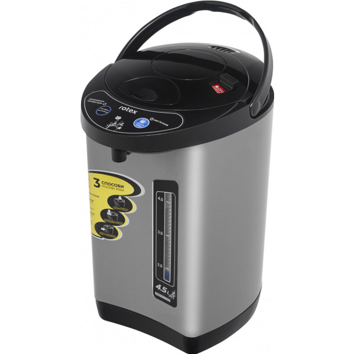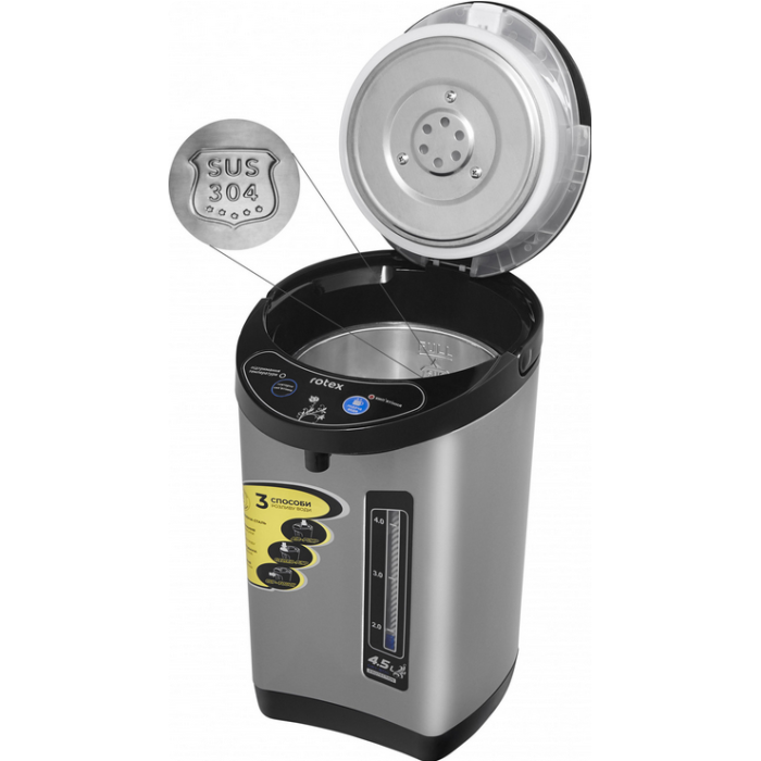 Живлення - 220-240В, 50Гц, Потужність 800 Вт. Термопот. Об'єм 4,5 л. Прихований нагрівальний елемент із нержавіючої сталі. Колба із високоякісної нержавіючої сталі (сталь 304). Автоматичне відключення під час закипання. Блокування помпи для подачі води на кришці. 3 СПОСІБ РОЗЛИВУ ВОДИ: автоматичний, механічний, прямий (натискання клавіші чашкою за носиком подачі води). Підтримка температури води. Повторне кип'ятіння. Індикатор кип'ятіння. Індикатор підтримання температури. Захист від перегріву. Захист від перебігу. Матеріал: нержавіюча сталь. Колір: нержавіюча сталь.