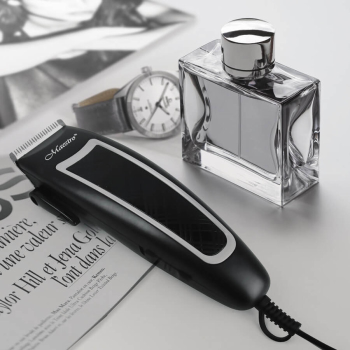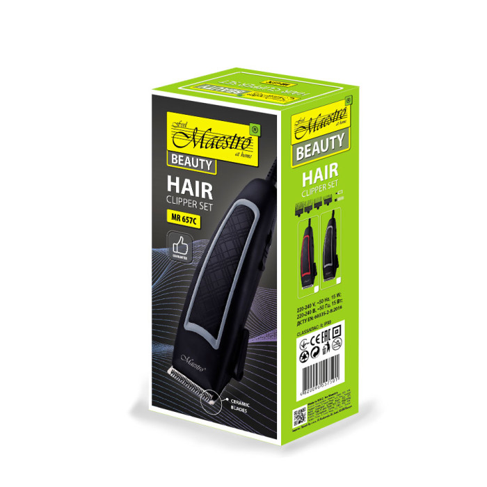 Універсальна стрижка Maestro MR-657C - відмінна модель, вона підійде для домашнього використання, але її можливості дозволять з деякими обмеженнями працювати і в професійній сфері. Симпатичний дизайн, сучасні технології та висока якість поєднуються в моделі. Характерна риса машини - робота від електромережі. З одного боку, бездротові моделі мають кращу мобільність. Але з іншого, ви отримуєте стабільну потужність та готовність до роботи у будь-який момент. При цьому досить довгий електрокабель забезпечує достатню свободу при стрижці. Головна особливість даного електроприладу – наявність високоякісних керамічних ножів. Вони гарантують точну та безболісну процедуру, в результаті якої ви отримаєте професійну стрижку. У комплекті 4 насадки-гребня для стрижки 3, 6, 9, 12 мм. Для догляду за машинкою для стрижки в комплекті щіточка для очищення лез масло для їхнього змащення.