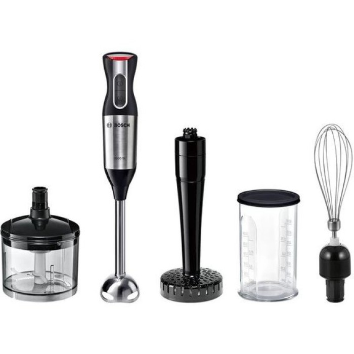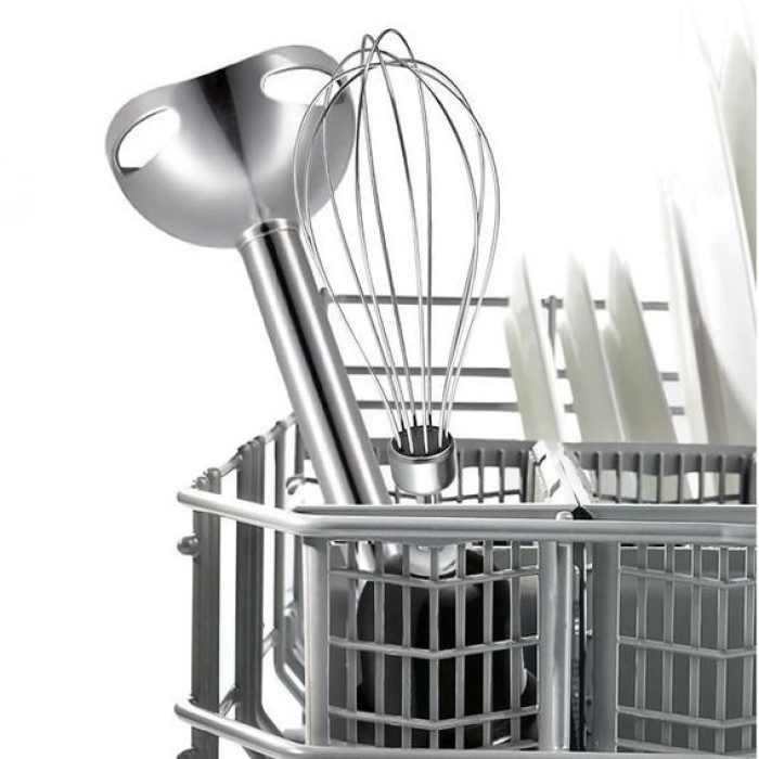 Модель зручна при зберіганні, швидко наводиться в робочий стан та прискорює процес приготування деяких страв. Блендер складається з ручки із вбудованим мотором, насадки, кнопок та механізмів керування. Виготовляється апарат із чорного пластику та нержавіючої сталі. Ручка має ергономічну форму з м'яким покриттям, завдяки чому вона комфортно лежить у руці та знижує віддачу від вібрації. Чаша для збивання та мірна склянка, які йдуть у комплекті, зроблені з прозорого пластику. Усі робочі аксесуари можна мити в посудомийній машині. Сам прилад досить компактний – 39 см завдовжки у зібраному вигляді.