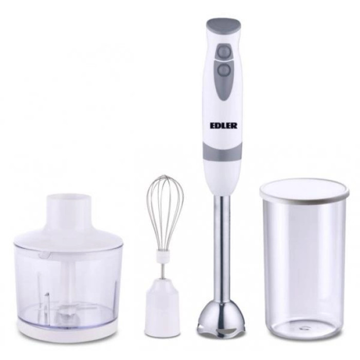 Занурювальний блендер, потужність 700 Вт, 2 швидкості, занурювальна частина металева, ножі з нерж. сталі, подрібнювач - 0.5 л, мірна склянка - 0.6 л, віночок для збивання, корпус із пластику.