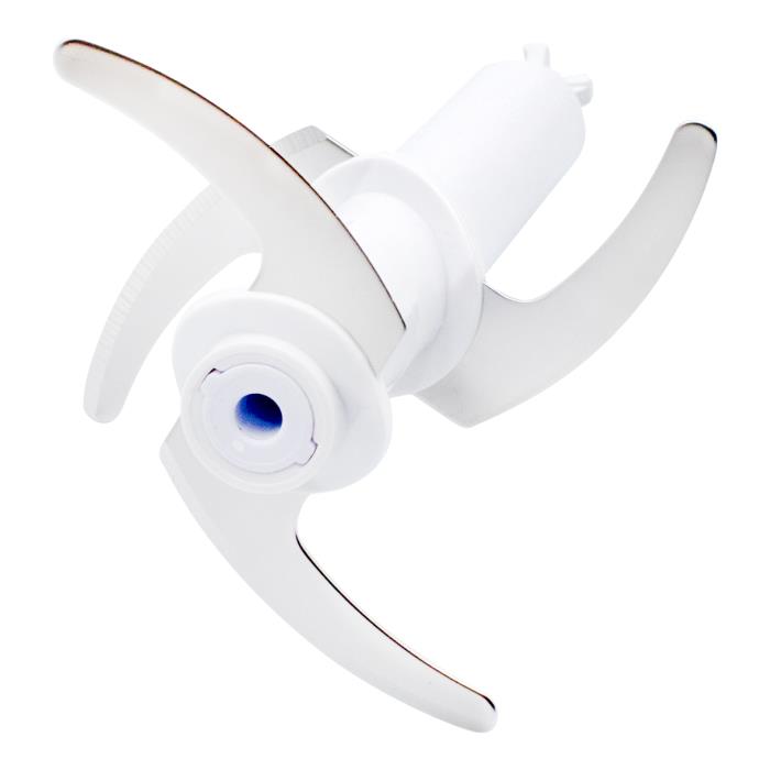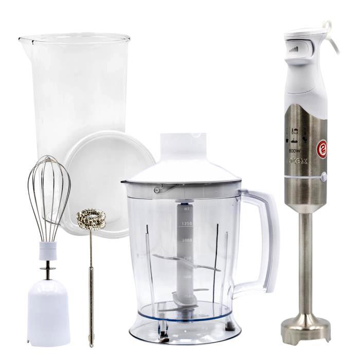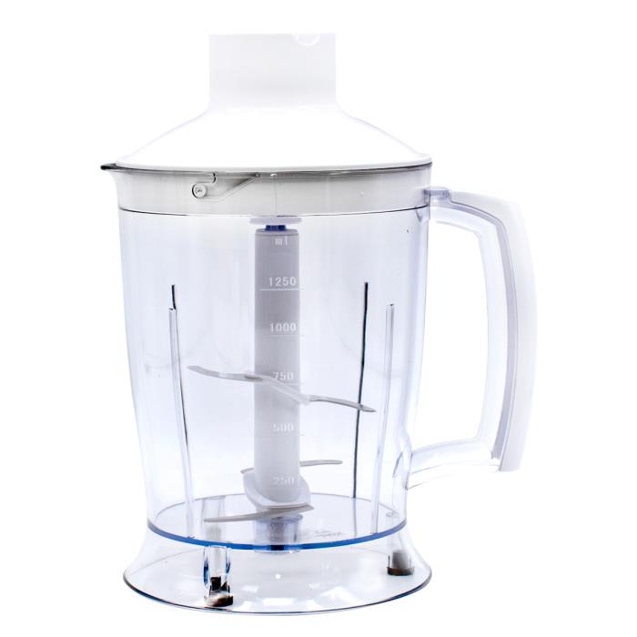 Живлення - 220-240В, 50Гц, Потужність 800 Вт. Плавний контроль швидкості. Ніж з нержавіючої сталі з титановим покриттям. Пластиковий корпус зі знімною ногою. Нога з нержавіючої сталі. Чаша з подрібнювачем 1250 мл з двома ножами. Аксесуари: вінчик, мірний стакан 600 мл, вспінювач молока.. Ручка з петлею для підвішування. Колір білий.