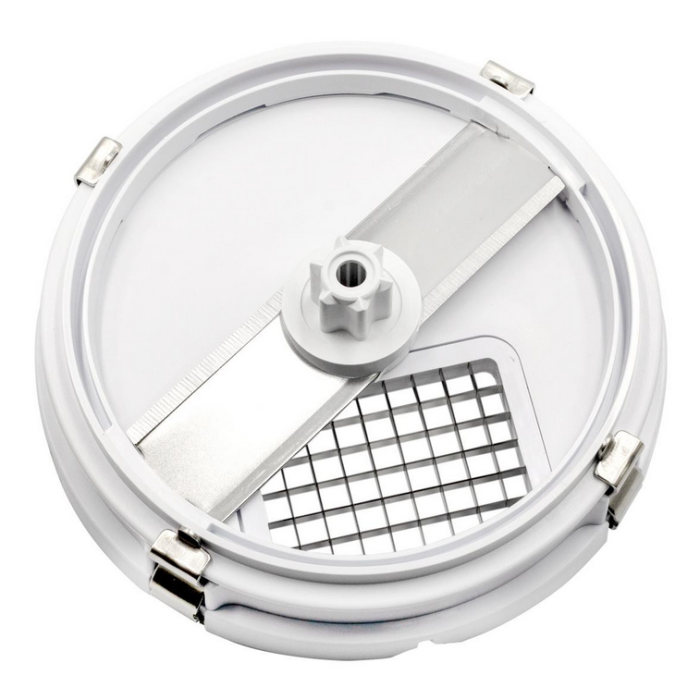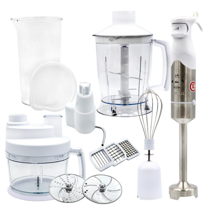 Стаціонарний блендер Rotex RTB970-W - ручне мережеве пристрій, виконаний у білому пластиковому корпусі з ніжкою з нержавіючої сталі. У ньому встановлений двигун потужністю 800 Вт з плавним регулюванням швидкості обертання. Ріжучі ножі, виготовлені з нержавіючої сталі з титановим покриттям, мають високу міцність, довговічність і ефективністю. Модель укомплектована 2 чашами і мірним стаканом зі шкалою ємністю 0,6 літра. Одна чаша об'ємом 2 літри служить для дроблення і нарізки кубиками, а інша - об'ємом 1,25 літра виконана з подрібнювачем з двома ножами. Крім того, разом з приладом поставляється велика кількість насадок і аксесуарів: віночок, терки і шинкування, 2 насадки для нарізки кубиками і для нарізки соломкою. Зберігається погружной блендер Rotex RTB970-W підвішеним за петлю на ручці.