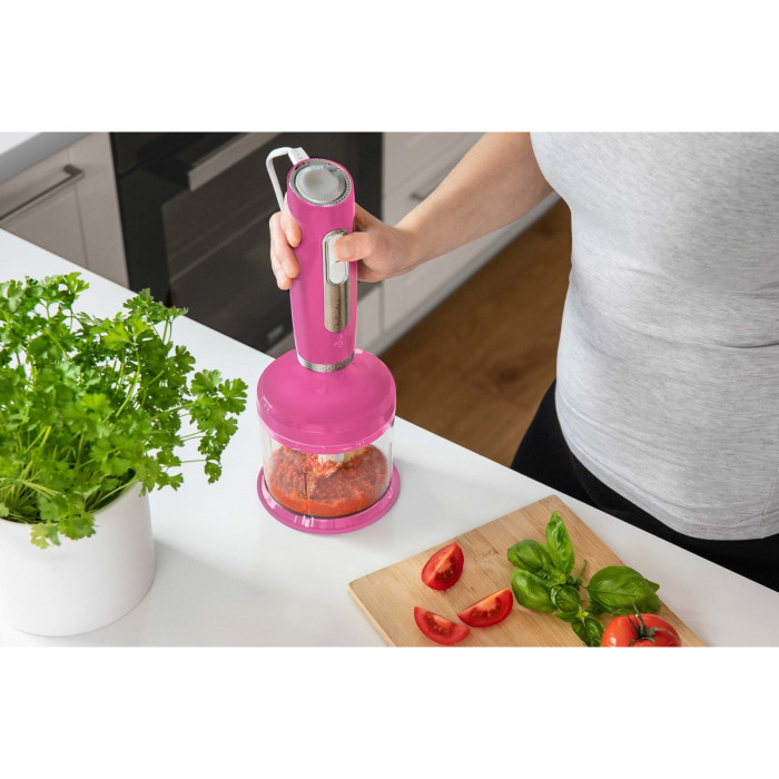 Ручний блендер для змішування м'яких інгредієнтів та рідин, дитячого харчування, молочних коктейлів, соусів, спредів. Віночок для приготування легкого тіста чи збивання вершків, яєчних білків, кремів, майонезу. Подрібнювач для подрібнення більш важких продуктів, таких як напівтвердий або твердий сир, фрукти та овочі, горіхи, зелень. 6 лез з нержавіючої сталі з титановим покриттям та криголамом.