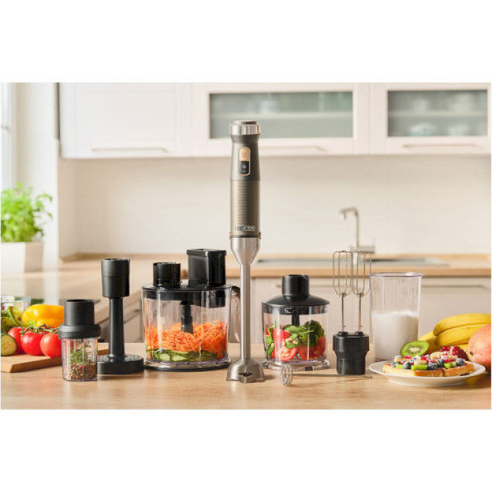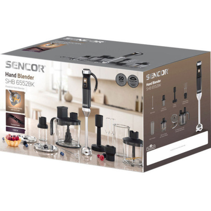 Ручний блендер Sencor SHB 6552BK – це універсальний пристрій, що забезпечує неперевершену продуктивність на кухні. Цей інноваційний блендер потужністю 1500 Вт має технологію Titanium QuadBlade, що гарантує ідеальні результати змішування. Його ніжка для змішування з нержавіючої сталі довжиною 20 см дозволяє легко та ефективно обробляти інгредієнти різними способами. Завдяки плавному регулюванню швидкості та ергономічній ручці користуватися блендером стає надзвичайно комфортно. Варто відзначити, що ніж із нержавіючої сталі гарантує довговічність і точність при змішуванні навіть найтвердіших інгредієнтів. Крім того, аксесуари також виготовлені із нержавіючої сталі, що робить їх стійкими до високих температур. Цей блендер 10 в 1 не тільки універсальний, а й довговічний, що підтверджується 10-річною гарантією на двигун. Завдяки йому ви легко впораєтеся як з повсякденними, так і складнішими кулінарними завданнями.