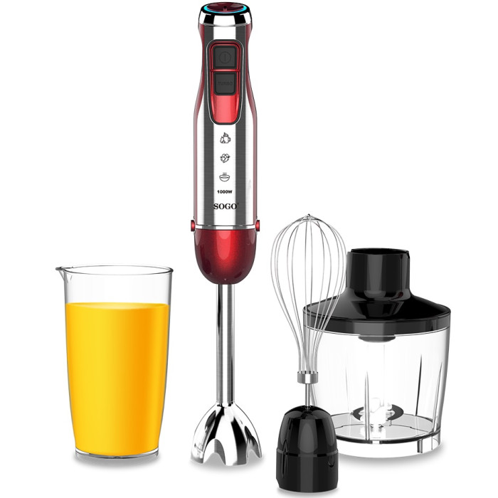 Занурювальний блендер, потужність 1000 Вт, металева ніжка, 4 ножі з нержавіючої сталі з титановим покриттям, кнопкове керування, імпульсний режим, подрібнювач 500 мл, мірна склянка 600 мл, віночок, комфортна рукоятка