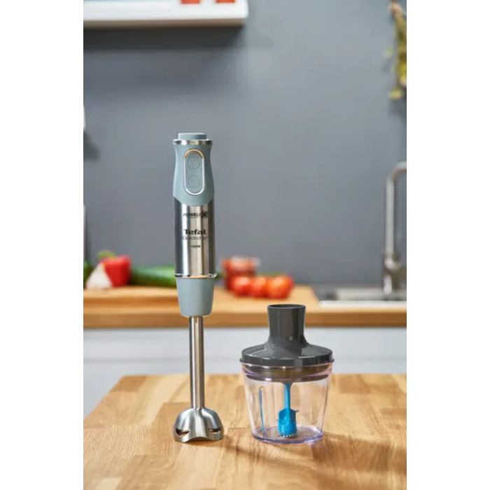 Стаціонарний блендер Tefal HB65KD38 - це ручний високопродуктивний і мнгофункціональний прилад потужністю 1000 Ватт. У ньому використовуються поліпшені леза, що дозволяють швидко і якісно подрібнювати продукти. 20 можливих швидкостей обертання можна вибрати і перемикати без зупинки за допомогою простого контролера з підсвічуванням. Конструкторськими особливостями моделі є кришка від бризок і ергономічна протиковзка ручка, які не тільки зручні, але і виконують функції забезпечення безпеки. Крім основного, пристрій здатний працювати ще в турбо і імпульсному режимах. Забезпечують реалізацію різноманітних можливостей приладу пов'язаного обладнання: міксер об'ємом 800 мл, подрібнювач ємністю 500 мл, віночок з нержавіючої сталі, насадки для колки льоду і морозива. Всі частини погружного блендера Tefal HB65KD38 легко встановлюються і знімаються, а мити їх можна в посудомийній машині.
