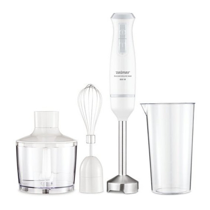 Занурювальний блендер Zelmer надасть вам швидку та професійну допомогу на кухні. Продуманий підхід до вибору насадок позначився на високій функціональності та практичності пристрою. Оцініть потужність, продуктивність, надійність техніки, виготовленої за фірмовими стандартами якості Zelmer. Блендер Zelmer ZHB4562S потужністю 800 Вт неймовірно проста у використанні. Ергономічна форма рукоятки і зручна кнопка управління дозволяють користуватися блендером однією рукою. Наявність турборежиму дає можливість легко впоратися із подрібненням навіть твердих інгредієнтів. Блендер оснащений місткою мірною склянкою об'ємом 800 мл. Використовуйте подрібнювач об'ємом 450 мл для подрібнення горіхів, зелені, сиру, овочів та фруктів. Міцний металевий 2-лопатевий ніж не боїться високих навантажень і справляється з будь-яким завданням.