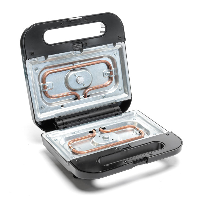 Пристрій оснащений знімними панелями з антипригарним покриттям розміром 21,6х12 см. Це дозволяє готувати страви без використання великої кількості олії, що робить їжу більш корисною та спрощує процес очищення.