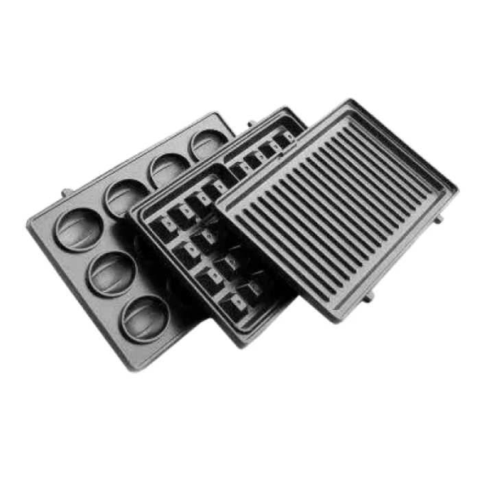 Прилад має 4 змінні насадки із тефлоновою поверхнею. Матеріал не дозволить стравам пригоріти та зробить користування комфортним. Шматочки їжі не залишатимуться на пластинах, а догляд вимагає лише протерти вологою губкою після використання. За безпеку можна не турбуватися: девайс захищений від перегріву.