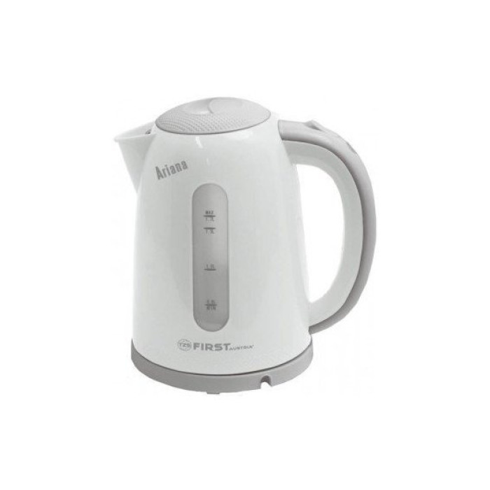 Корпус електрочайника First FA 5427-2 виготовлений з термостійкого пластику та представлений у двох кольорових варіантах: білий/блакитний, білий/жовтий. Шкала індикатора рівня води оточена чудовим візерунком. Моделі характерний стильний та сучасний дизайн, який добре вписується в інтер'єр кухні. Ергономічна ручка електрочайника зручно лежить у руці і не ковзає під час його переміщення. На ній розташована кнопка вмикання/вимикання приладу та світловий індикатор роботи.
