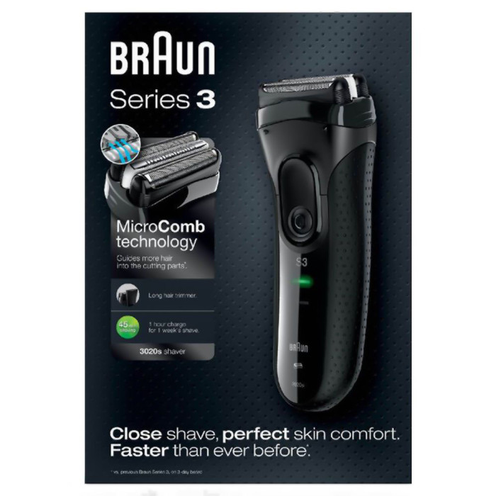Бритва Braun Series 3 3020 Black – прекрасне рішення проблеми щоденного гоління. Вона допоможе вам правильно доглядати за вашою шкірою, при цьому, не викликаючи роздратування, не роблячи порізів. Ви зможете голитися швидко і комфортно завдяки інноваційній технології MicroComb, яка гарантує ретельне гоління будь-якої щетини. Ця технологія допомагає направляти волоски до тримеру, який захопить та зріже їх. Оптимізовані рухливі елементи забезпечують максимальний контакт зі шкірою , адаптуючись до контурів вашого обличчя. Купити Series 3 3020 Black – означає придбати якісну бритву для щоденного користування.