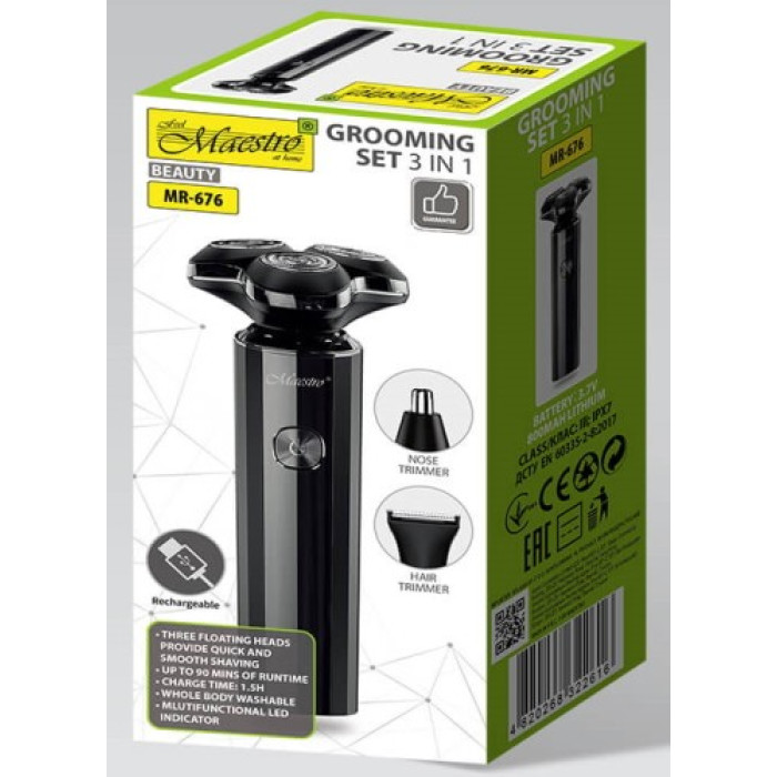 Набір для стрижки волосся 3 в 1 Maestro MR-676 працює на літієвій батареї, завдяки чому зручно брати із собою у поїздки.