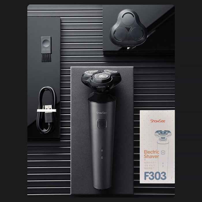 Xiaomi Showsee Electric Shaver F303 (F303-BK) – електробритва в максимально компактному корпусі з дивовижною функціональністю. Електробритва оснащена електродвигуном, що видає 3000 обертів за хвилину. На внутрішній стороні розташована кнопка включення та вимкнення приладу. Пристрій дуже зручно брати з собою на відпочинок чи відрядження. Електробритва захищена за стандартом IPX7, легко чистити та промивати леза під водою. У компактному корпусі встановлений літій-іонний акумулятор ємністю 600 мАг. Заряджається пристрій за допомогою кабелю USB Type-C, який входить до комплекту постачання. Пристрій оснащений 3 голівками, що плавають, що можуть повторювати вигини обличчя. Кожна головка складається з двох кільцевих лез, що забезпечує максимально швидке та ефективне гоління. Ретельно пророблена конструкція електробритви подарує лише позитивні відчуття від використання пристрою.