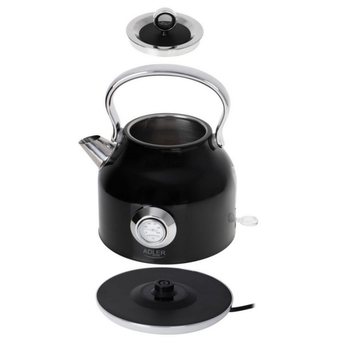 Класичний електричний чайник з термометром із системою контролю безпеки STRIX стане в нагоді на будь-якій кухні. Його безпека забезпечується блокуванням, що запобігає включенню порожнього чайника, та автоматичним вимкненням, коли вода закипає. Функціональність підвищується завдяки стійкій підставці і індикатору рівня води, що легко читається. Він має максимальну потужність 2200 Вт і виготовлений з нержавіючої сталі, що робить його чемпіоном швидкого кип'ятіння води. Аналоговий індикатор температури води та витончений дизайн доповнять інтер'єр приміщення у будь-якому стилі.
