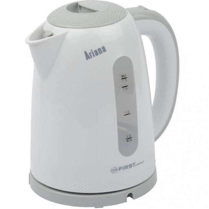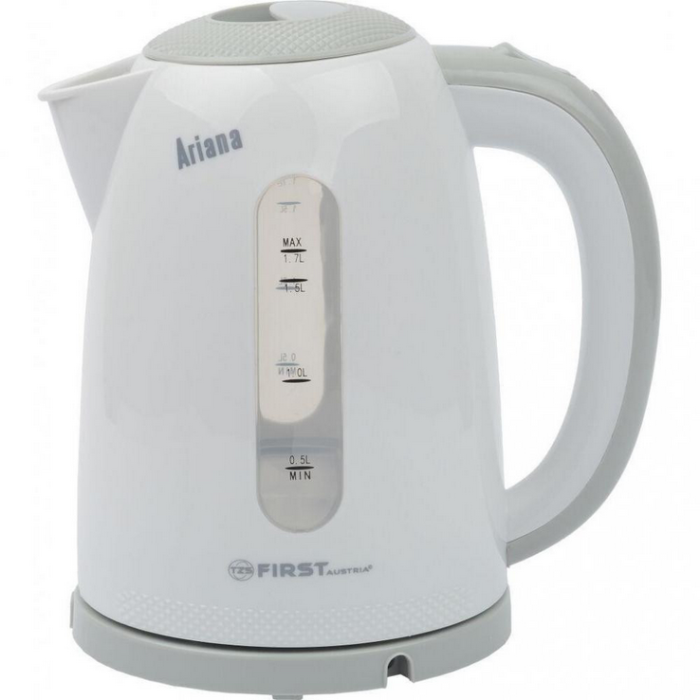 Шкала індикатора рівня води електрочайника First FA 5427-2 розташована із двох сторін, що дуже зручно. Електрочайник позбавлений дроту і йому є обертання на підставці на 360°. Це досягається за допомогою спеціальних, круглих контактів у підставці та днищі чайника. Шкала проградуйована у літрах (0.5л, 1.0л, 1.5л, 1.7л). Щоб уникнути випадкового відкриття кришки електрочайника, передбачено спеціальний блокатор. У носику чайника розміщено фільтр від накипу.