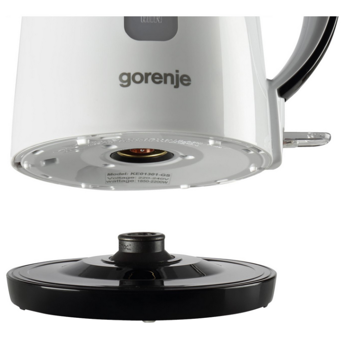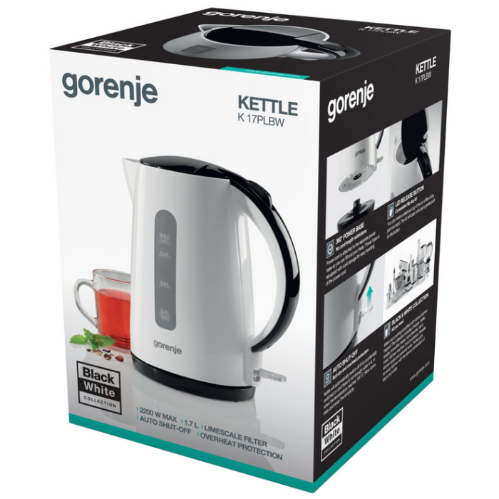 Електрочайник Gorenje K17PLBW виготовляється у пластиковому корпусі білого кольору з чорними елементами: кришкою, зовнішньою частиною ручки, а також підставкою. Пристрій місткістю 1,7 літра має шкалу з поділками, за якими контролюється рівень заповнення. Щоб залити воду, натисканням на кнопку слід відкрити дах, що відкидається, з функцією фіксації. Модель обладнана дисковим нагрівальним елементом потужністю 2200 Вт та термостатом Strix. Вона встановлюється на нековзна прогумована основа, на якій може обертатися на 360 градусів. Крім того, у підставці є відсік, в який змотується шнур живлення завдовжки 0,8 метра. Знімний і фільтр, що миється, від накипу, встановлений в носику, не допускає капання води при наливанні в чашку. Електрочайник Gorenje K17PLBW захищений від перегріву та автоматично відключається, коли вода закипає.