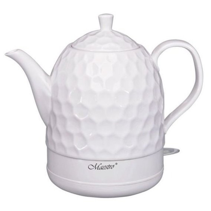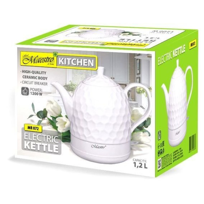 Керамічний чайник Maestro MR-072 має вишуканий дизайн у класичному білому кольорі, доповнений текстурованою поверхнею з відкидною кришкою та ідеальним виливом. Висока безпека гарантується автоматичним механізмом відключення, що активується після того, як чайник досягає повного кипіння, а також залишений технологією захисту від перегріву, забезпечуючи безпеку, енергозбереження та довговічність. Електрочайник виготовлений із 100% екологічно чистої кераміки для збереження корисних властивостей води. Жодного пластику, тільки безпечна здорова питна вода.