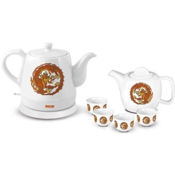 Електрочайник Mystery MEK-1624 є моделью, корпус якої виготовлений з кераміки високої якості.Нагрівальний елемент виконаний із сталі та надійно закритий від зовнішнього впливу.База передбачена поворотна, при цьому вона обертається на 360 градусів.При досягненні температури закипання води спрацює функція автоматичного вимкнення.Потужність сягає 1500 Вт.Виробником також передбачений відсік для зберігання та змотування шнура.У набір, крім чайника, входять також заварний чайник та чотири піали.